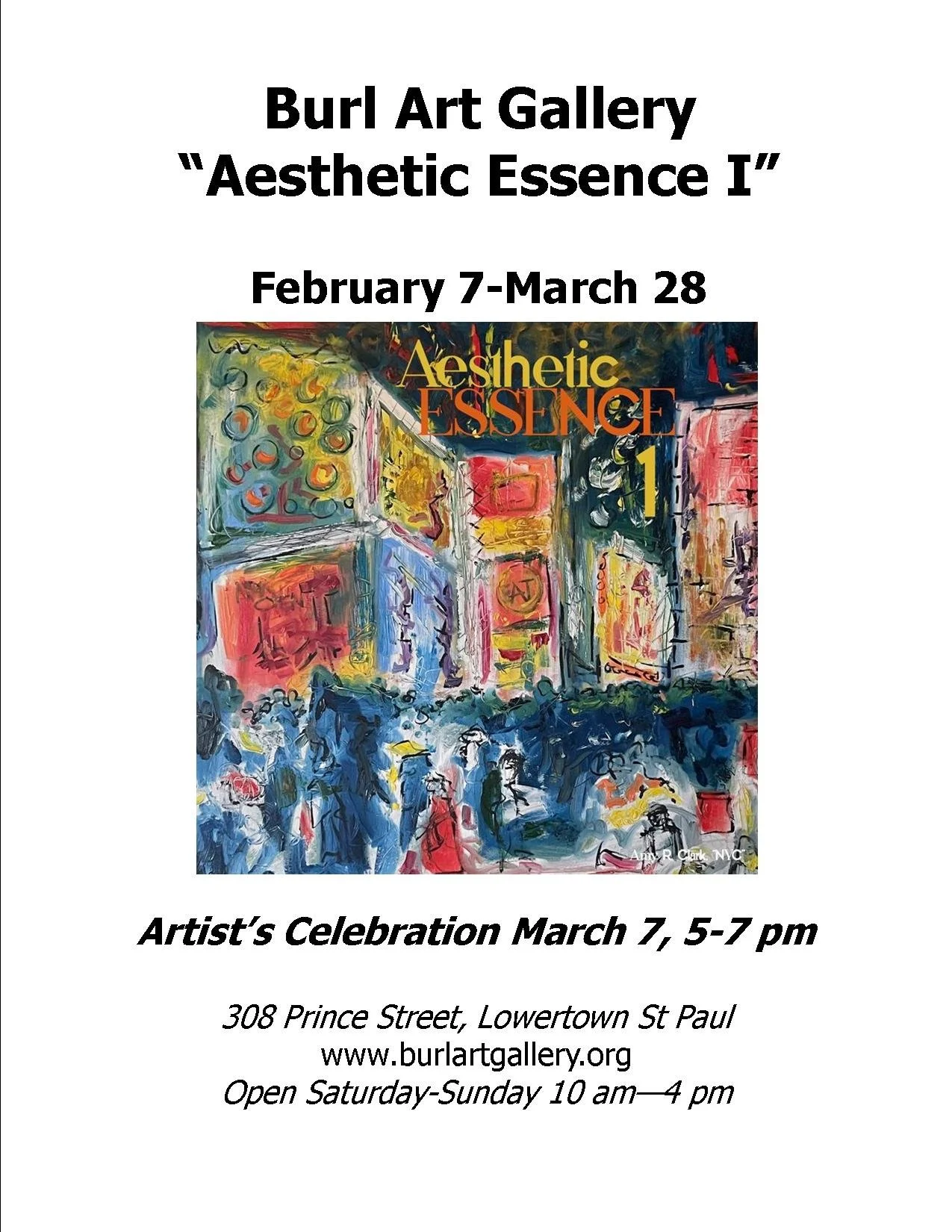 The nonprofit Burl Art Gallery opens its exhibition season with the first of four cycles of "Aesthetic Essence", a juried exhibit with an intentionally vague theme to encourage a diverse display. Artist Celebration March 7, 5-7 pm. Open Saturdays and Sundays, 10-4. 308 Prince Street, Lowertown St Paul; burlartgallery.org