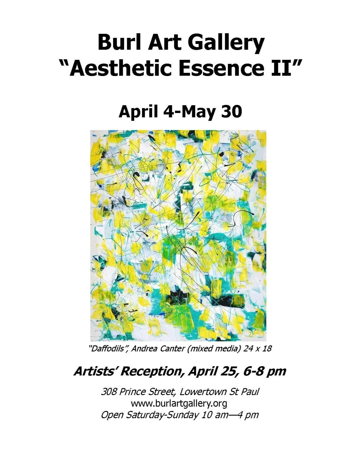 The nonprofit Burl Art Gallery presents its second exhibition of 2026 based on the theme, "Aesthetic Essence", a juried exhibit with an intentionally vague theme to encourage a diverse display. My mixed media experiment using a layer of clear duralar (thin plastic sheet), “Daffodils,” was accepted for this show. Artist Celebration reception April 25, 6-8 pm. Open Saturdays and Sundays, 10-4. 308 Prince Street, Lowertown St Paul; burlartgallery.org