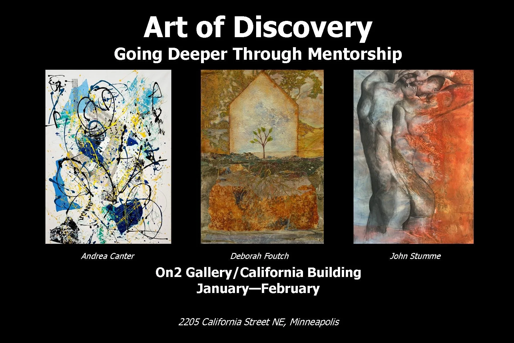 For the past 5+ years, I’ve participated in an art mentorship with Deborah Foutch. This exhibit in the On2 Gallery at the California Building showcases work by Deborah and two mentees—me and John Stumme. We had to postpone our original opening reception/discussion due to ongoing concerns with ICE. The building also remains locked to the public, hopefully reopening by mid-late February. We are working to extend the exhibit through March and will announce a new reception/discussion date soon! 2205 California Av NE, Mpls.